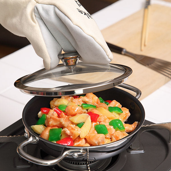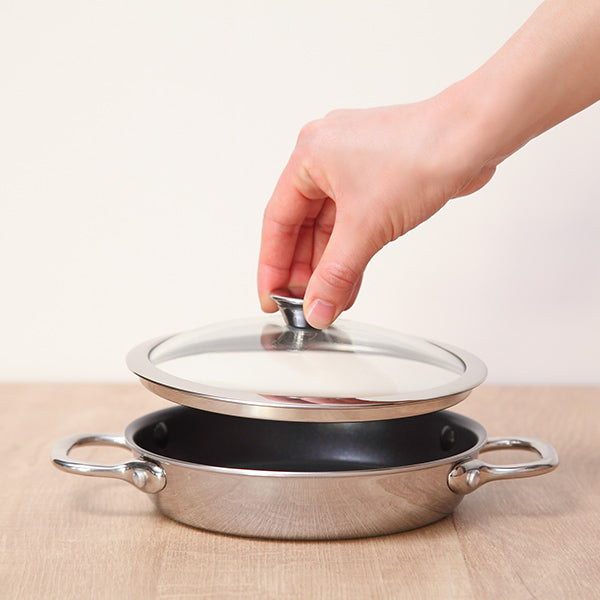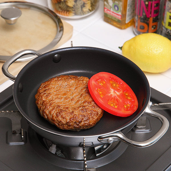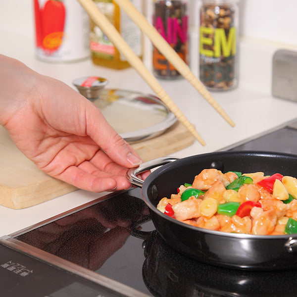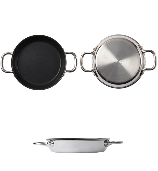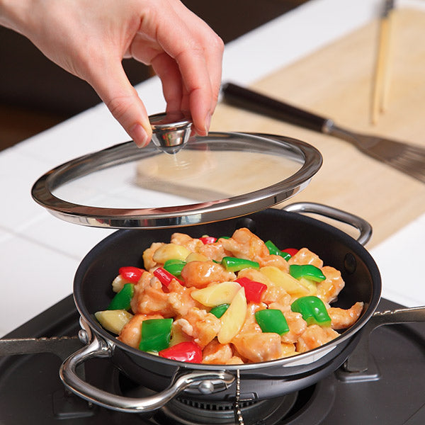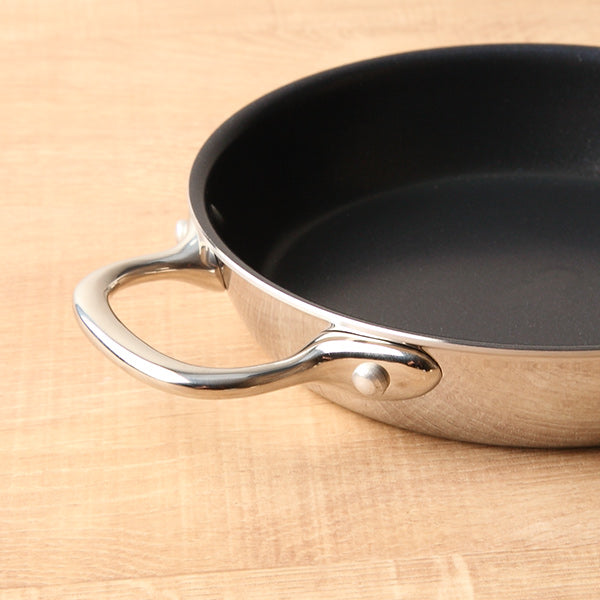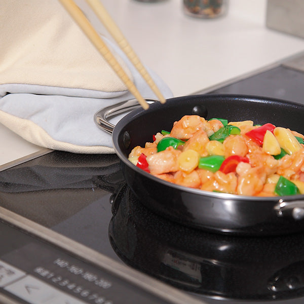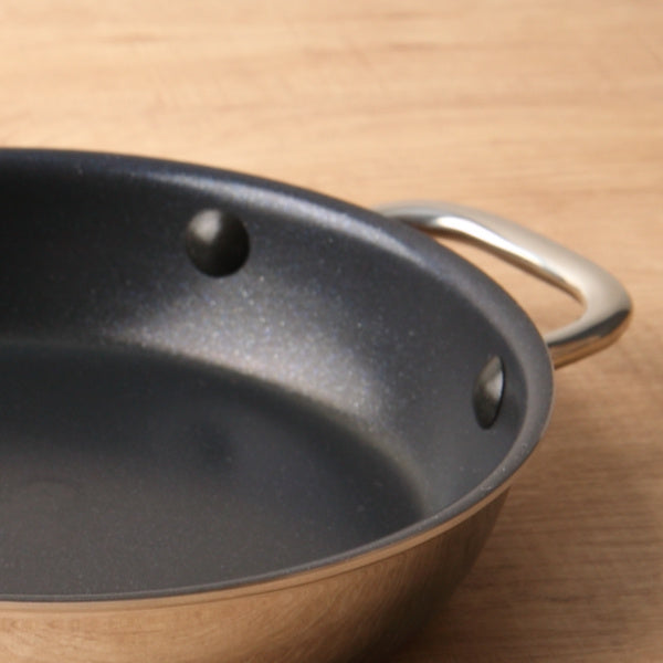 プロの現場で培われた性能をご家庭向けに造られた両手フライパンです。高効率ステンレスと極厚アルミの合金を使用している為、ガスでのご使用はもちろん、IHからのエネルギーも効率よく吸収して食材に伝導します。