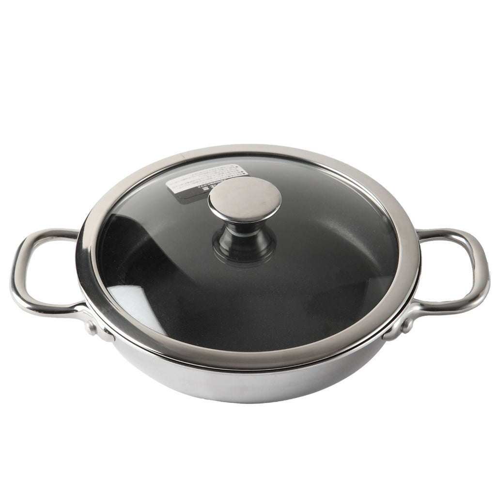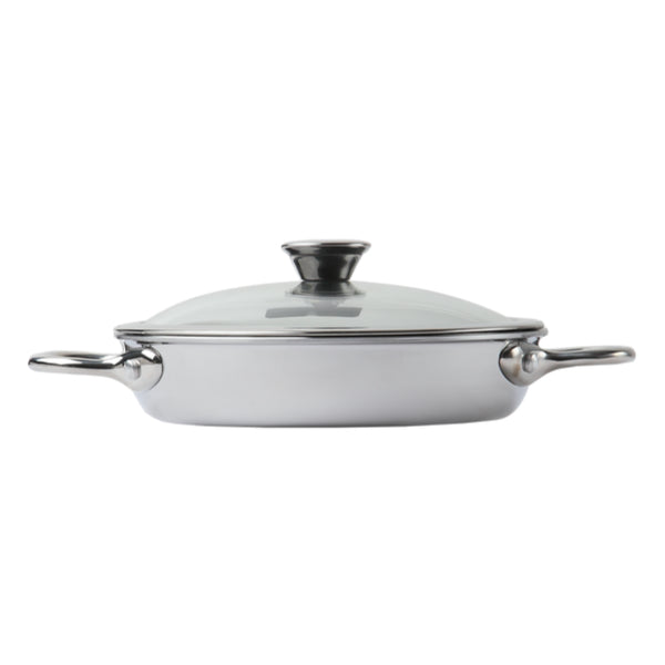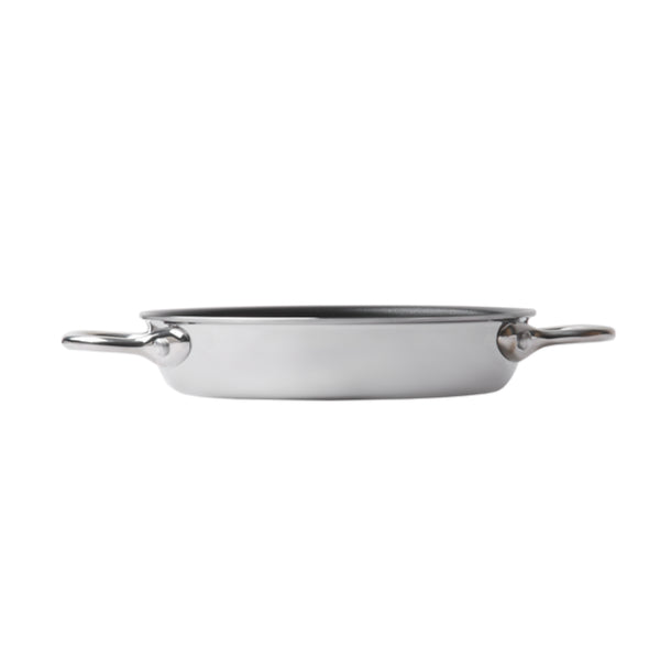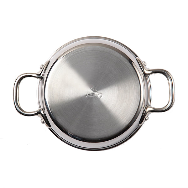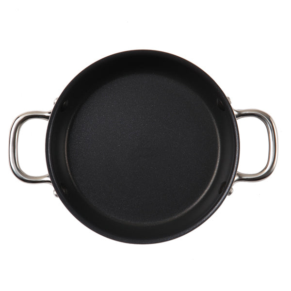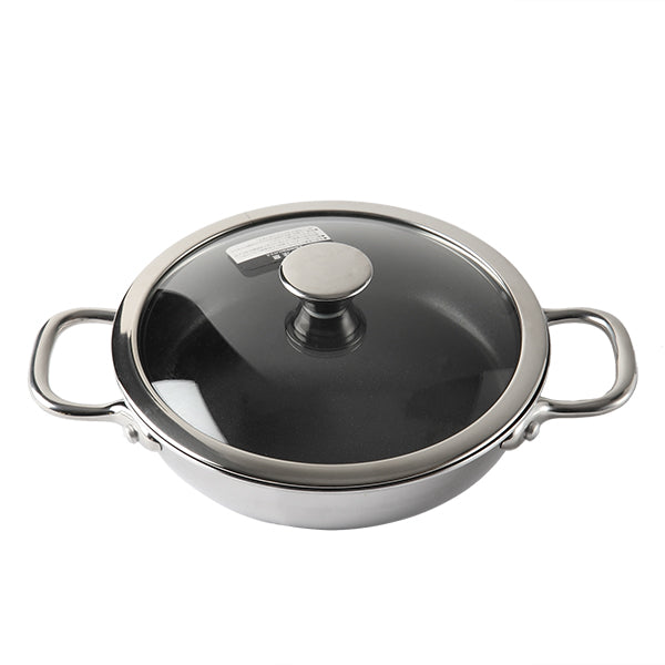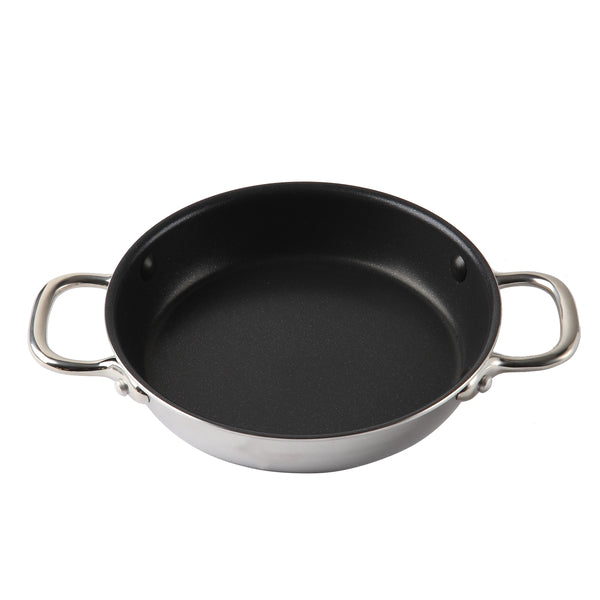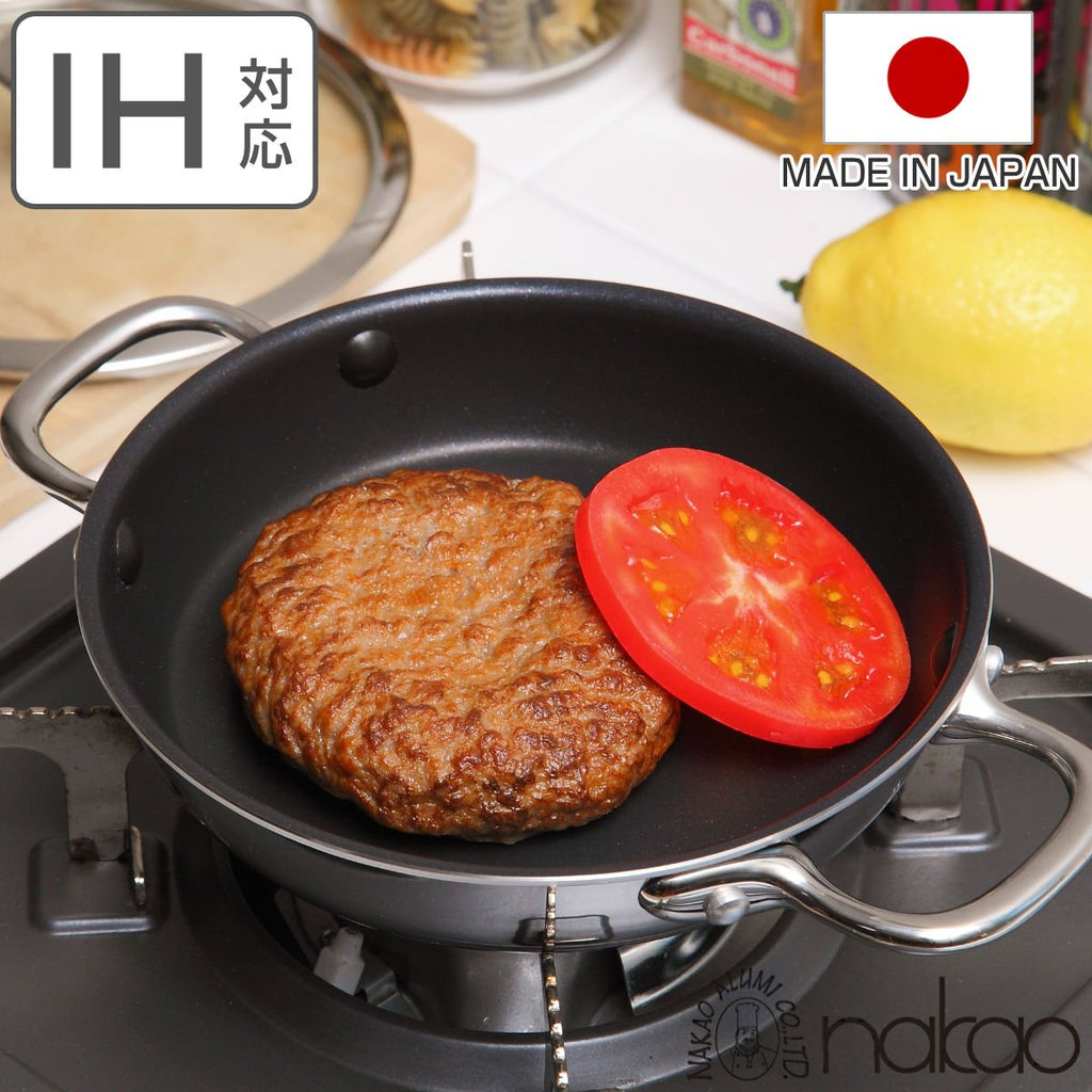 プロの現場で培われた性能をご家庭向けに造られた両手フライパンです。高効率ステンレスと極厚アルミの合金を使用している為、ガスでのご使用はもちろん、IHからのエネルギーも効率よく吸収して食材に伝導します。