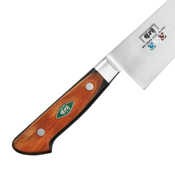 MXMシリーズの牛刀包丁には、刀身にモリブデン鋼を使用しています。サビに強く、切れ味の持続性の良い包丁です。刀身と一体のツバは衛生的に使え、アイテムも多く、シェフの方々に人気があります。