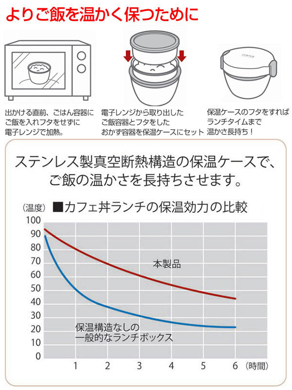 ※保温効力とは室温20度において、保温ケースにセットしたご飯容器に熱湯を310mlまで満たし空のおかず容器を入れた状態で湯温が95度の状態から6時間放置した場合におけるその湯の温度です。(JISS2006:1994 9.4準用)ご使用においてはご飯の量やおかず容器の内容物の量や温度、外気温の影響により、上記の保温効力の数値とは異なります。