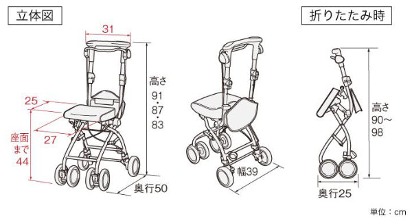 | サイズ | 約 幅39×奥行50×高さ83・87・91cm 座面高:44cm 折りたたみ時:幅39×奥行25×高さ90~98cm |
