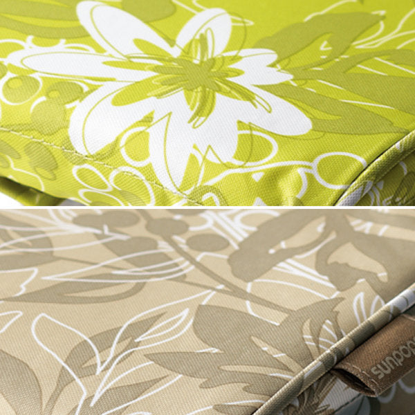 座面とバッグの柄は共に縁起ものの南天と福寿草をモチーフにしたオリジナルプリントです。アクティブなグリーンとエレガントなベージュからお選びいただけます。