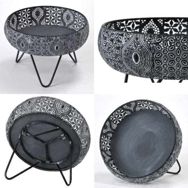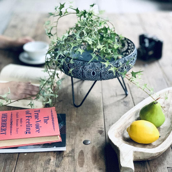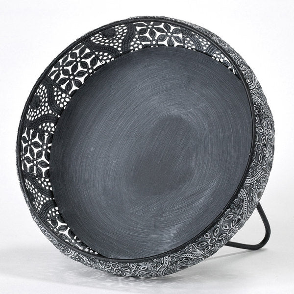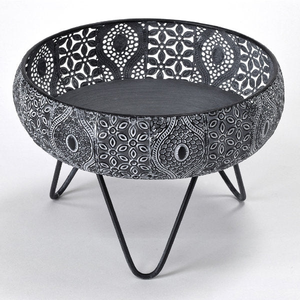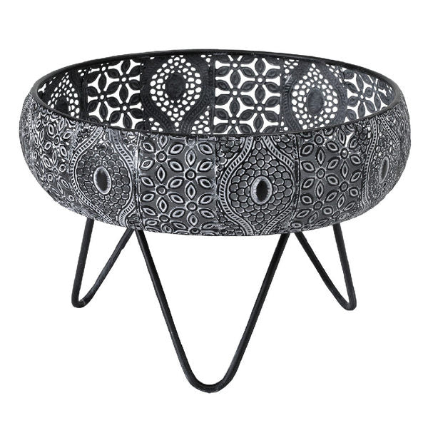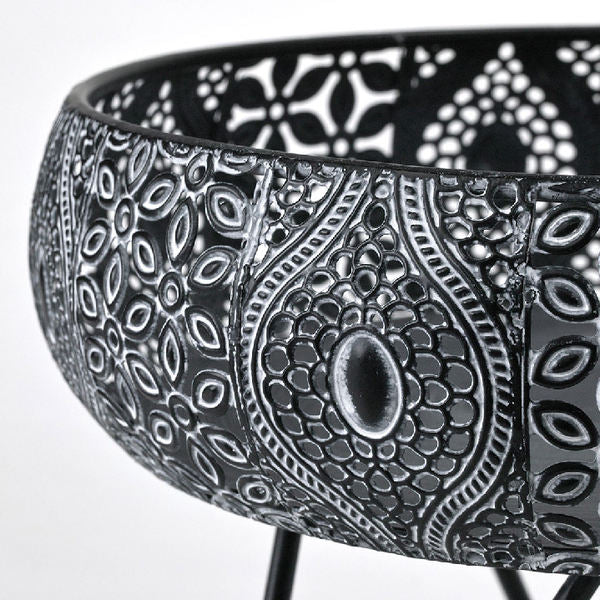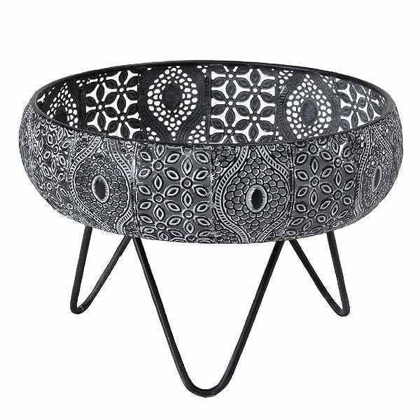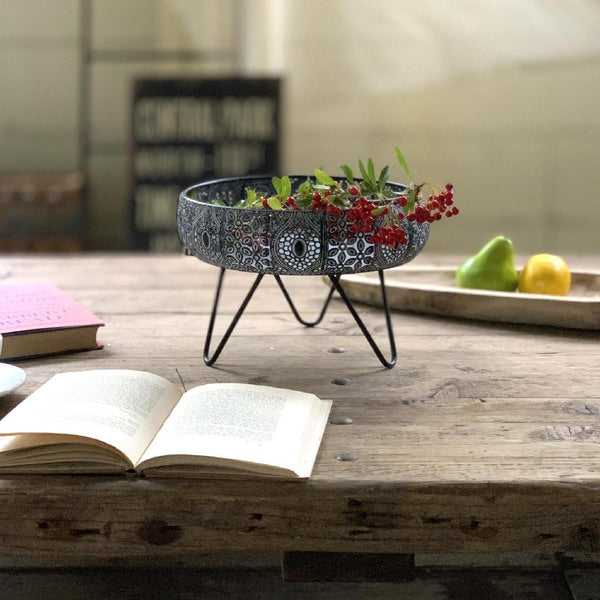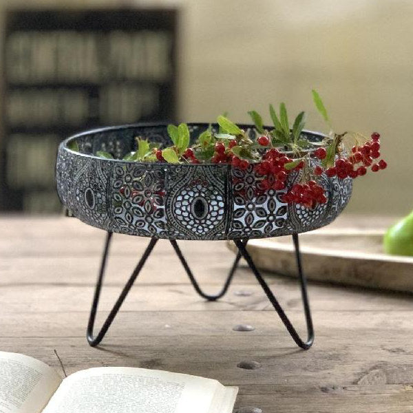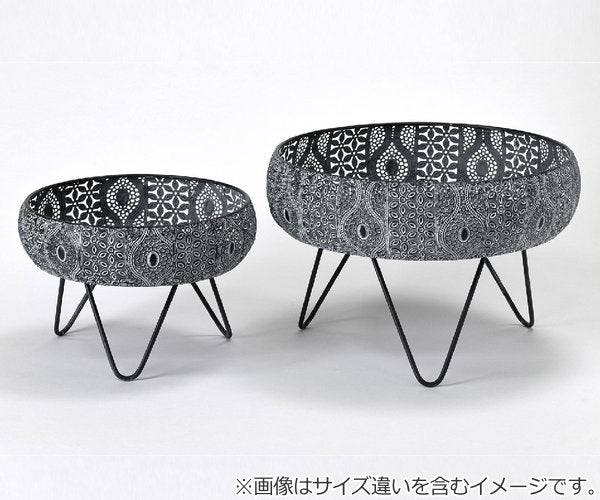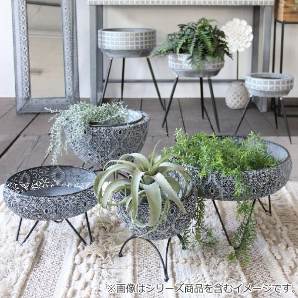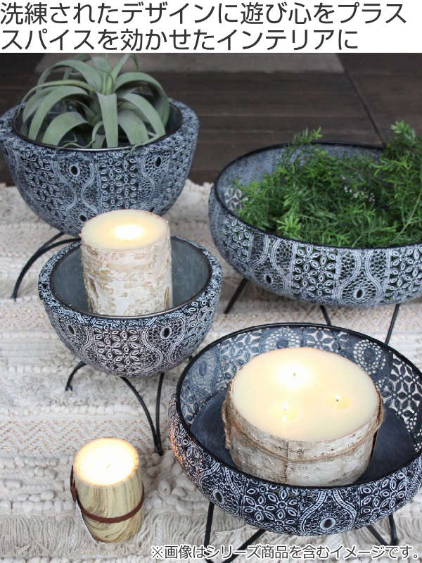 透かし彫りでアラベスク模様をほどこしたメタル素材の脚付きバスケットです。ドライフラワーやキャンドル、ツタ系の植物との相性がぴったりです。