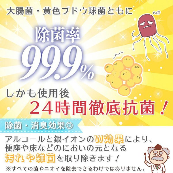 ●アルコールと銀イオンのW効果により、便座や床などの臭いの元となる汚れや雑菌を取り除きます。