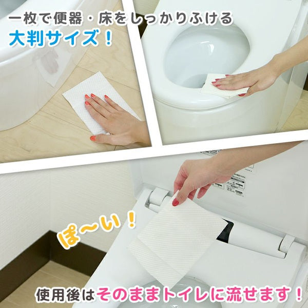 一枚で便器・床をしっかり拭く事のできる大判サイズです。ミシン目付きなので半分にして使用して頂く事ができます。用途に合わせてご使用ください。また、使用後はそのままトイレに流して頂けます。