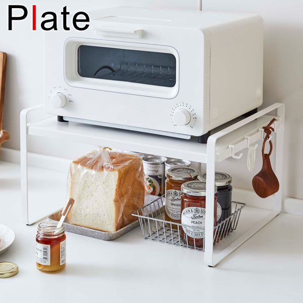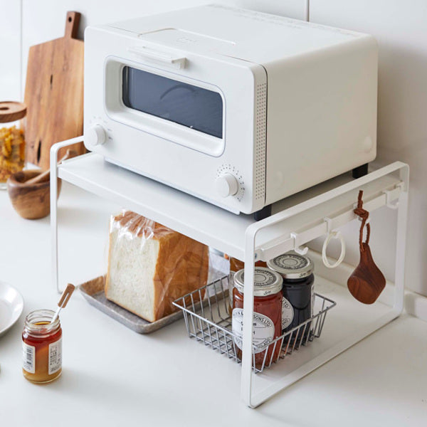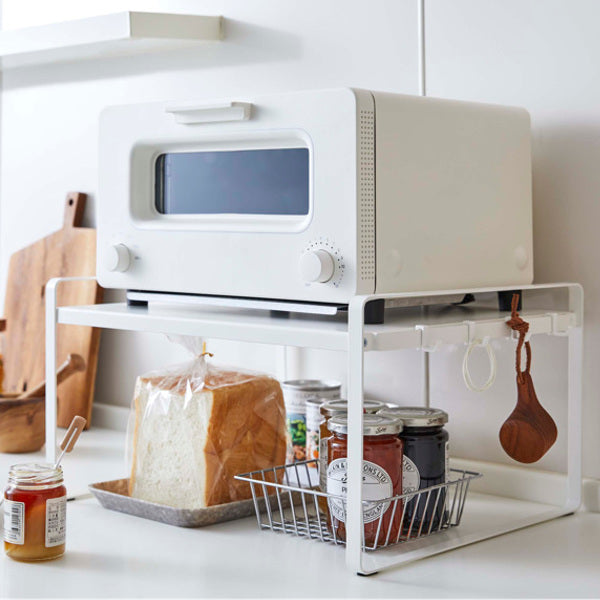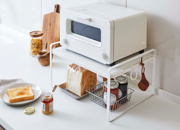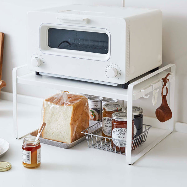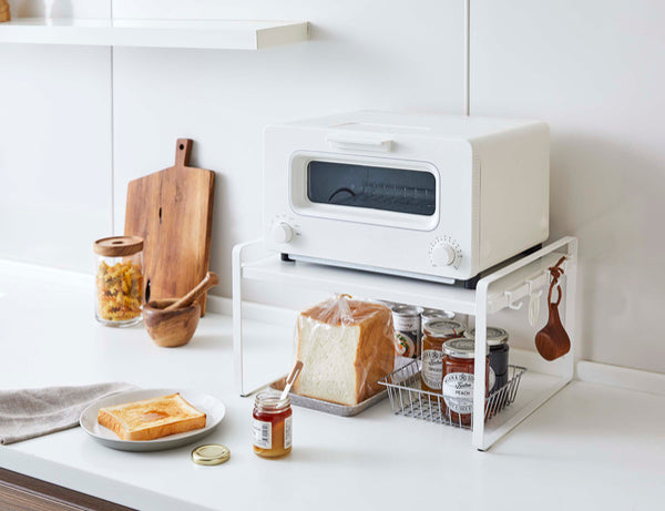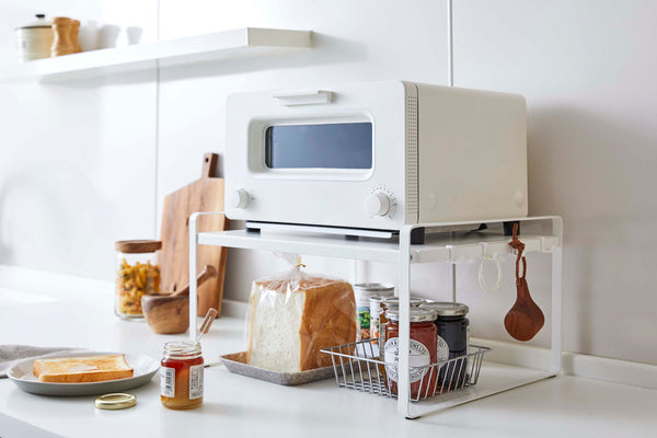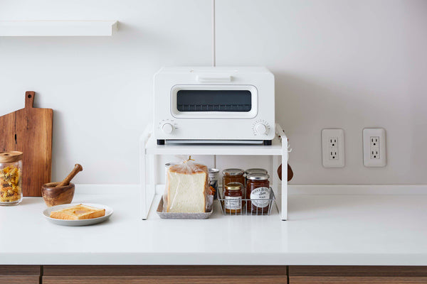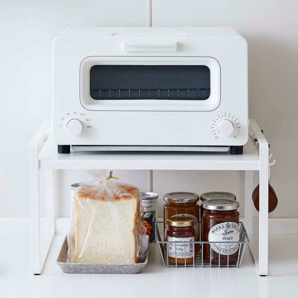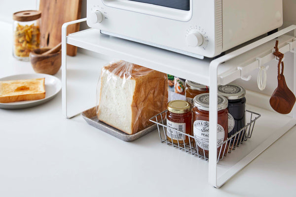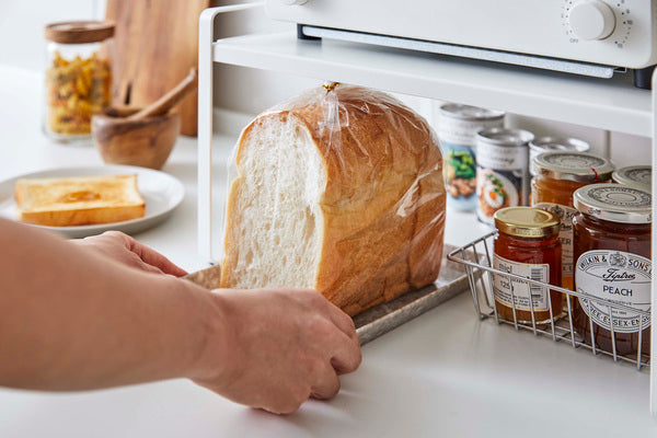 棚板下の高さは18cmとゆったり設計なので、山型の食パンや背の高いジャムの瓶なども収納できます。普段は何も入れず、焼いたパンをのせるお皿や焼きあがった料理などを一時置きするスペースにしても便利です。