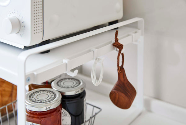 ラックの側面に付属のフックを引っ掛けられます。キッチン小物を手の届くところに掛けておけるため便利です。