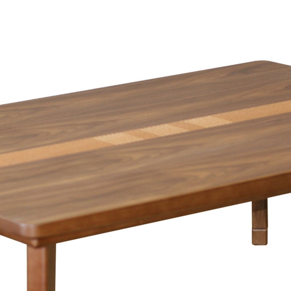 天然木ならではの綺麗な木目が印象的な家具調こたつです。ウォールナットとシルキーオークの二種類の突板を使用した真ん中のラインが印象的なデザインです。落ち着きのある色合いなので、和室はもちろん、洋室にもお使いいただけます。飽きのこないシンプルなデザインは長くご使用していただけます。