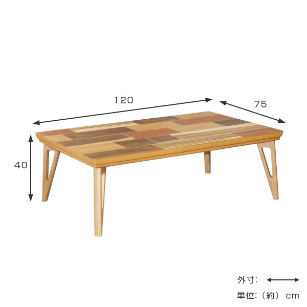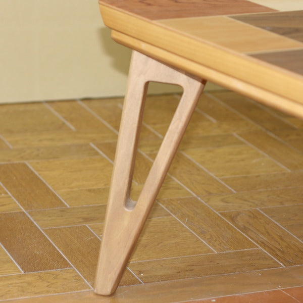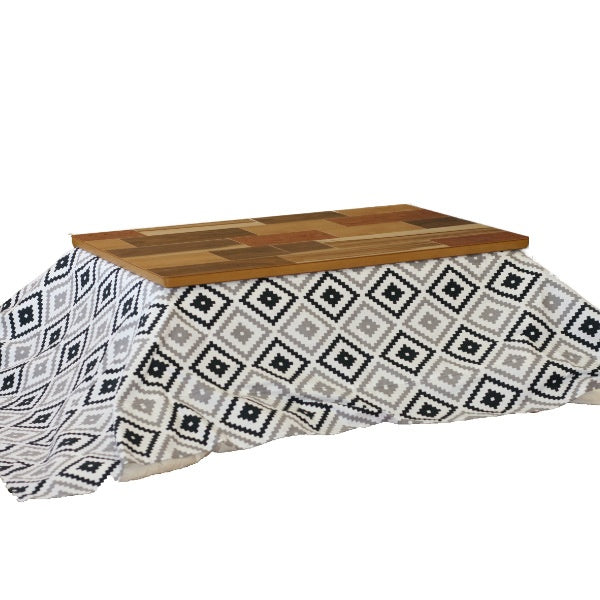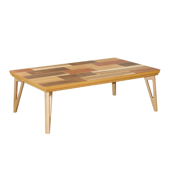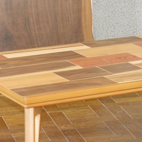 ランダムに継ぎ合わせた天板が目を引く家具調こたつ