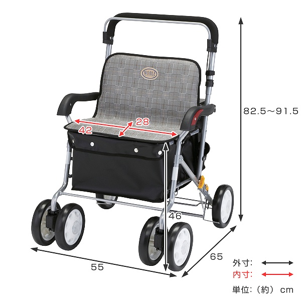 | サイズ | 約 幅55×奥行65×高さ82.5〜91.5(cm) 折りたたみサイズ:約 幅56×奥行26×高さ81(cm) 座面サイズ:約 幅42×奥行28(cm) 座面高:約 46cm バッグサイズ:約 幅36×奥行30×高さ21(cm) 車輪サイズ:約 7インチ |