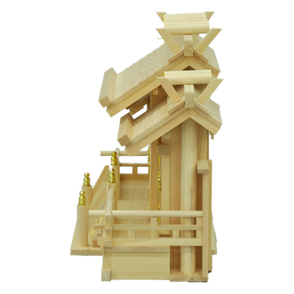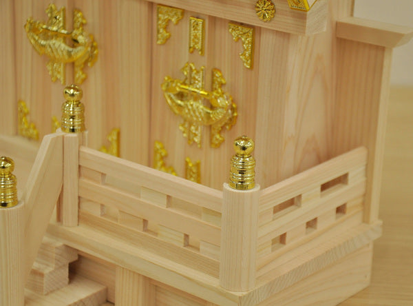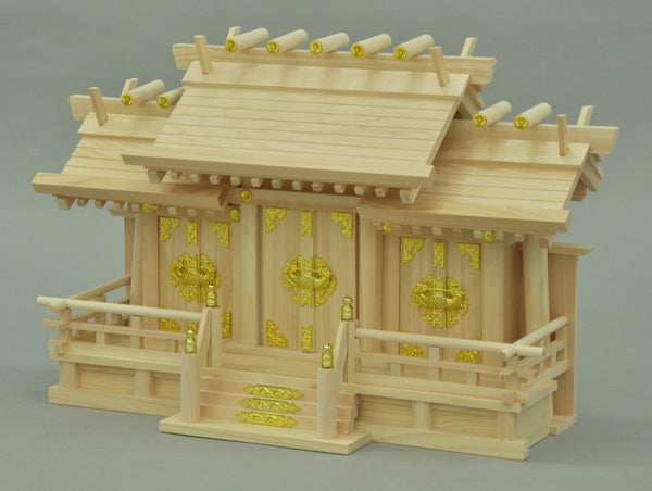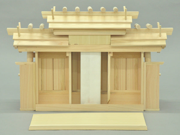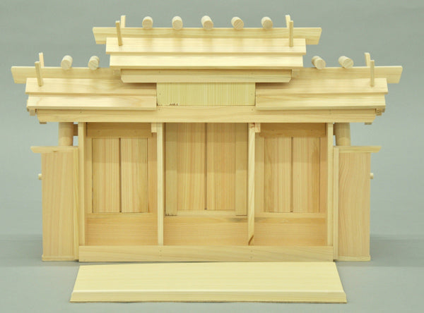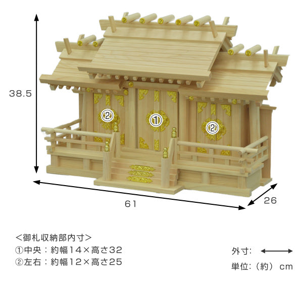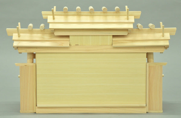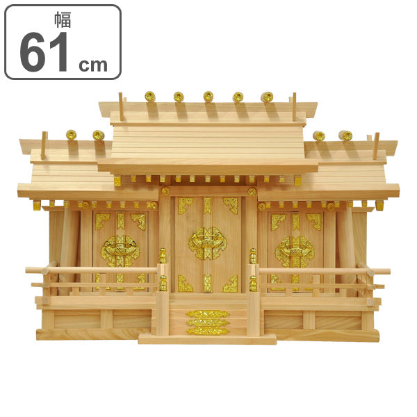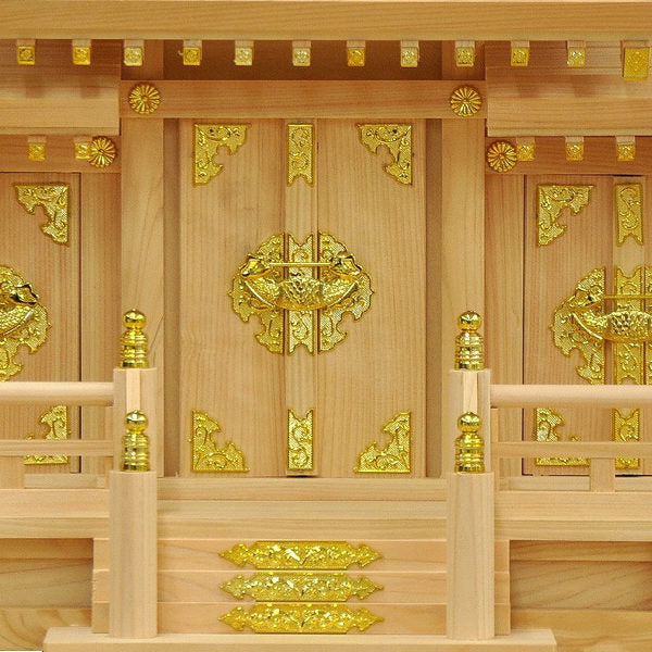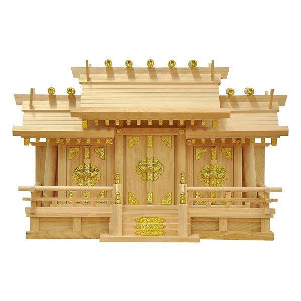 国内工場で生産された日本製の神棚です。国産桧仕様で、丁寧に作り込まれています。中央の社の屋根が一段高い屋根違い三社の神棚です。