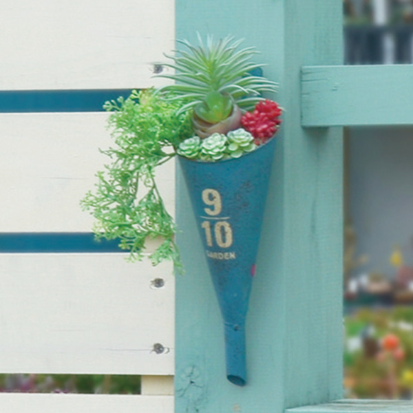 漏斗の形がユニークなブリキ製の壁用プランターです。多肉植物を植えたり、エアプランツを置いて個性的なお庭作りが出来るアイテムです。ドライフラワーを飾り、お部屋の壁をデコレーションしても素敵です。