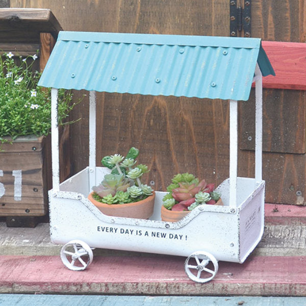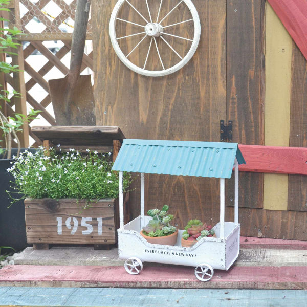 ブルーの屋根がポイントのプランターです。要所要所に見える塗装の剥げた感じでアンティーク感をプラスしています。そのまま置いても、植物を植えておいても、お庭のワンポイントになることは間違いなしです。