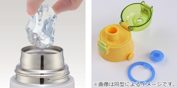 口径が広いので大きな氷も入れやすく、しっかり洗えて清潔に保てます。キャップユニットに付属しているパッキンは2つだけなので、お手入れ簡単です。