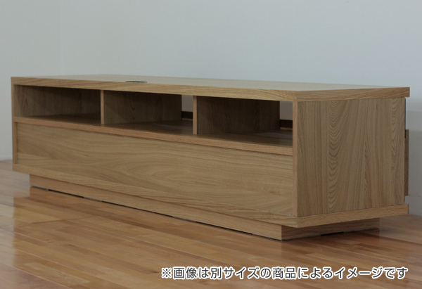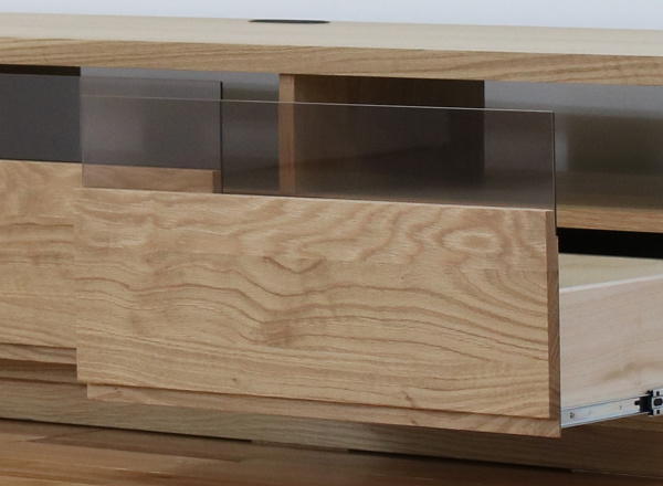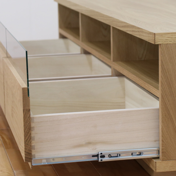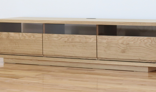 1枚の長い無垢材から材料取りをしているので、木目が通っており、高級感と美しさを演出しています。木のぬくもりがリビングに馴染むシンプルなデザインのテレビボードです。