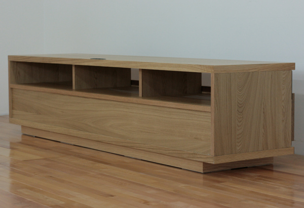 1枚の長い無垢材から材料取りをしているので、木目が通っており、高級感と美しさを演出しています。木のぬくもりがリビングに馴染むシンプルなデザインのテレビボードです。