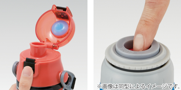 お手軽ワンタッチオープン直飲み・コップは両タイプともボタンを押すだけのワンタッチ方式です。シンプル操作で小さなお子様でも簡単に開閉できます。
