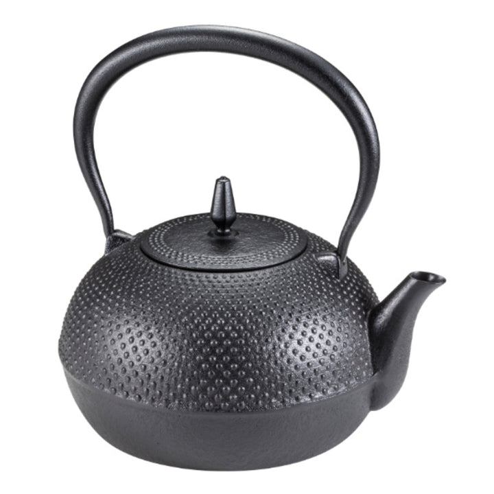 これぞ南部鉄瓶と言える定番のあられ模様が、側面とフタの縁にも施されています。その模様の凹凸の分だけ表面積が増し、肉厚になります。これにより、鉄瓶本体に蓄えられる熱量が増えるため、保温効果は一層高まります。お湯を沸かす時間も短時間で済みます。先人の卓抜な知恵と緻密なデザインが今も受け継がれています。