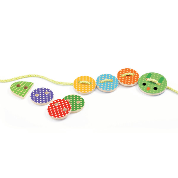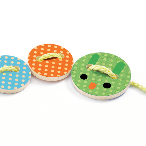 パーツに紐を通して遊ぶ紐通しです。目で確認した穴の位置に的確に紐を持っていく練習ができます。この動きを練習することにより、自分の目で見て書いたりする発想力へと繋がります。思わず笑顔になるデザインで、紐に通して遊ぶだけでなく、お部屋に飾って楽しむこともできます。