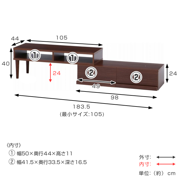 | サイズ | 約 幅200×奥行44×高さ40(cm) 伸張式:105〜200cm |