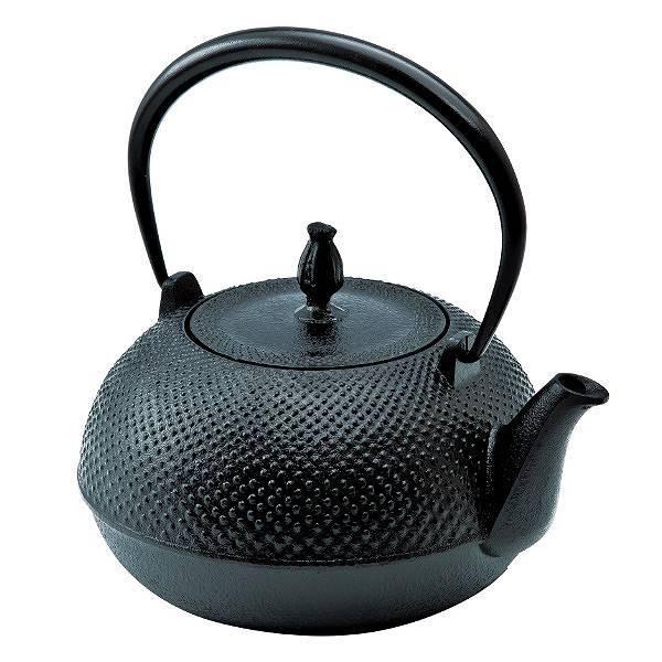 これぞ南部鉄瓶と言える定番のあられ模様が、側面とフタの縁にも施されている南部鉄瓶です。使い勝手を考えて、つまみと注ぎ口に「中子」を用いて成形した南部鉄瓶は、注ぎやすいのが特徴です。時代が変わっても色あせない伝統と知恵が今も受け継がれています。