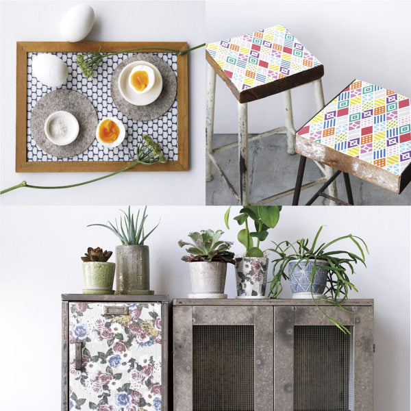 リメイクシートにはシンプルな柄からビンテージスタイルの柄まで、いろいろな種類があります。きっと好みの柄、お部屋に合った柄が見つかります。いろんな柄を組み合わせても素敵な空間ができあがりそうです。