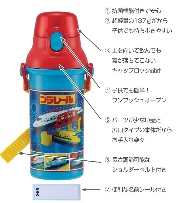 ●軽くて持ちやすいプラスチック製のプラレールの水筒です。