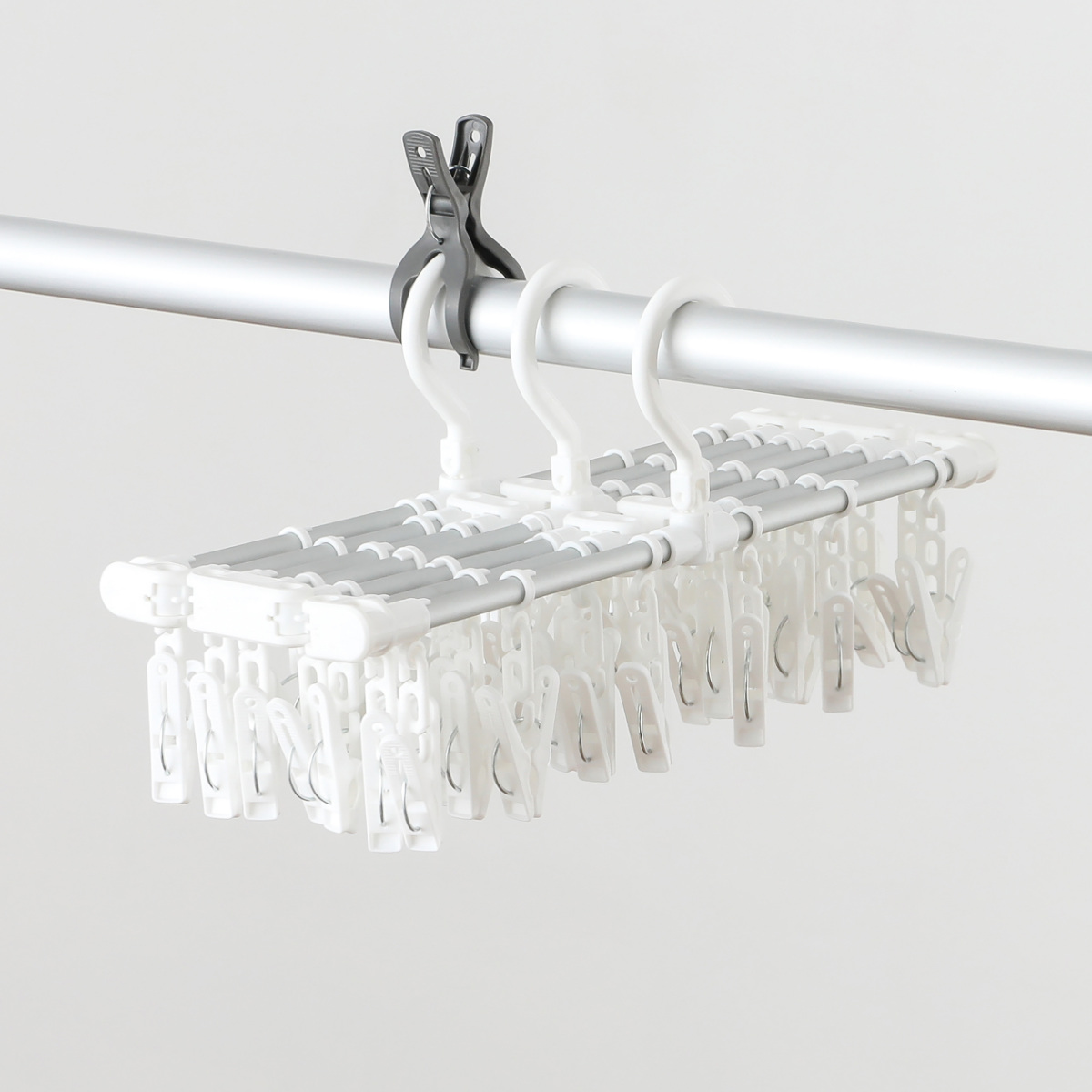 折りたたむと幅約12cmとスリムになり、収納時も場所をとりません。竿に掛けたままフックを固定すれば、片手で簡単に伸ばしてすぐに使えます。