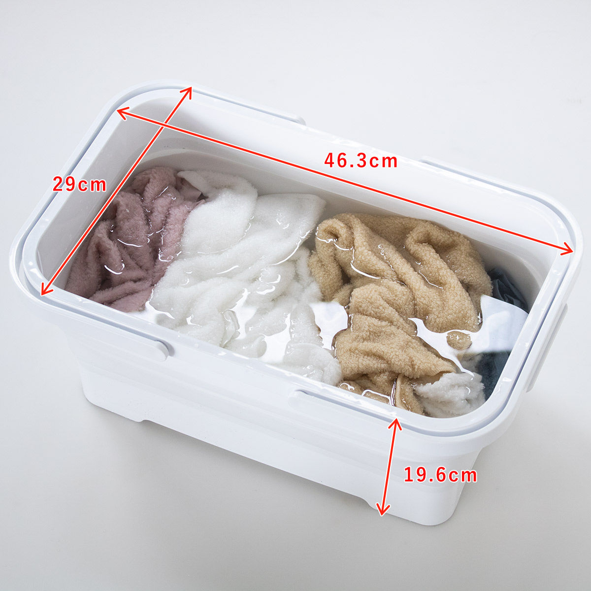 | サイズ | 約 幅46.3×奥行29×高さ19.6(cm) 外寸(上部):約 幅46.3×奥行29×高さ19.6(cm) (下部):約 幅36.5×奥行20(cm) 折りたたみ時:約 高さ6.8(cm) |