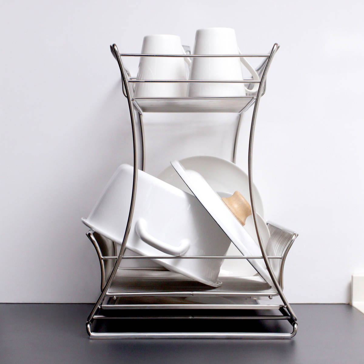 ゆるやかなカーブを描いた特殊な形状のワイヤーが、お皿のフチをしっかり支えてお皿が倒れにくいです。お皿を立てることで空気の通りが良くなり、乾きが速くなります。