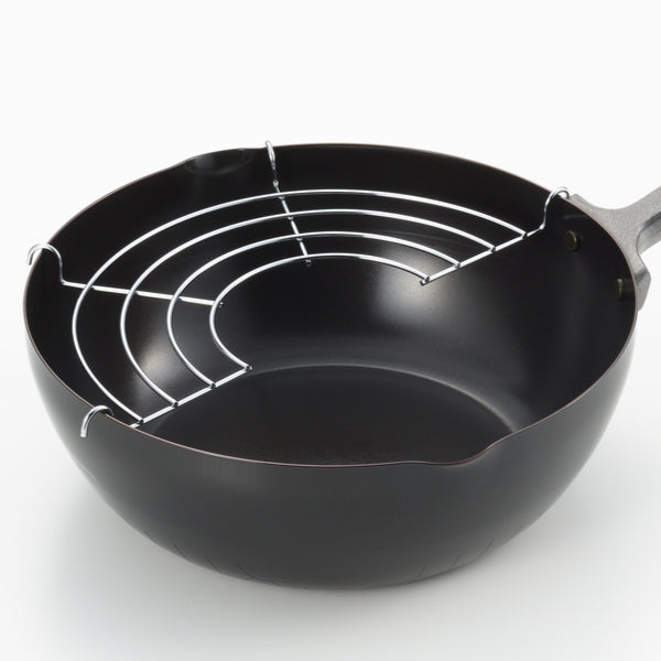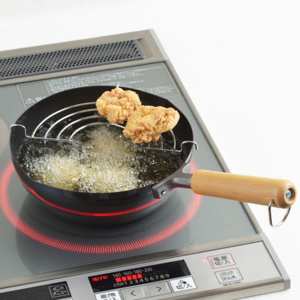 鉄製打出しの本格派の天ぷら鍋です。揚げ物に便利な揚げ網付きで、鍋の内側に適量ラインが刻印されています。揚げ網を外せばフライパンとして炒め物にも使え、深型なので食材を炒めてもコンロ周りにこぼれにくいです。