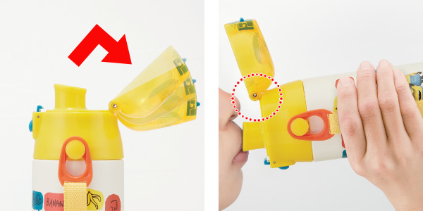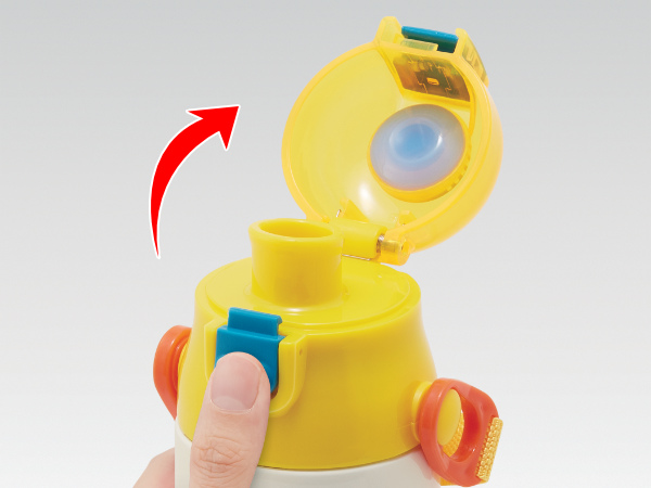 水筒の蓋はボタンを押すだけで開けることができるワンタッチ式です。飲み終わったら蓋をカチッと閉めるだけなので、小さなお子様でも簡単に開閉できます。