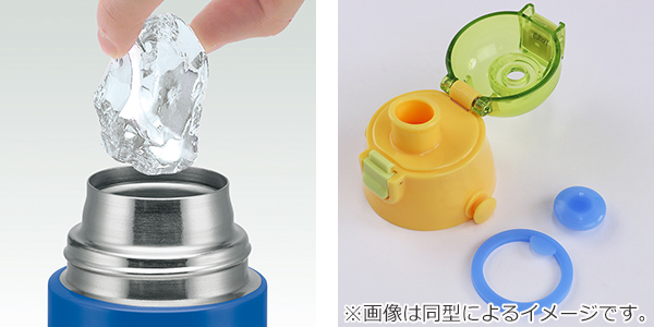 口径が広いので大きな氷も入れやすく、しっかり洗えて清潔に保てます。キャップユニットに付属しているパッキンは2つだけなので、お手入れ簡単です。