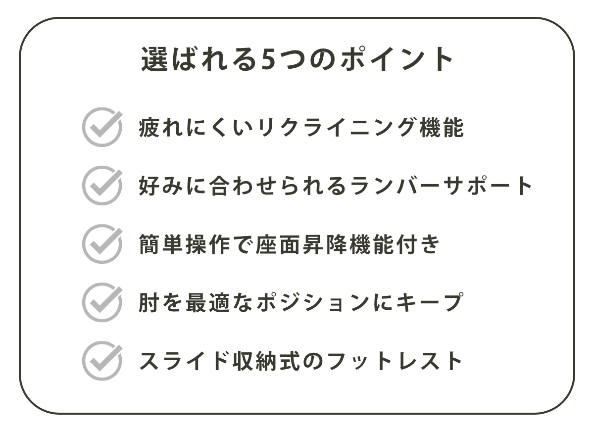 長時間のデスクワークには、座り姿勢のサポートと休息が欠かせません。長時間座っても疲れにくく、時には仮眠もとれる5つの機能を組み込みました。