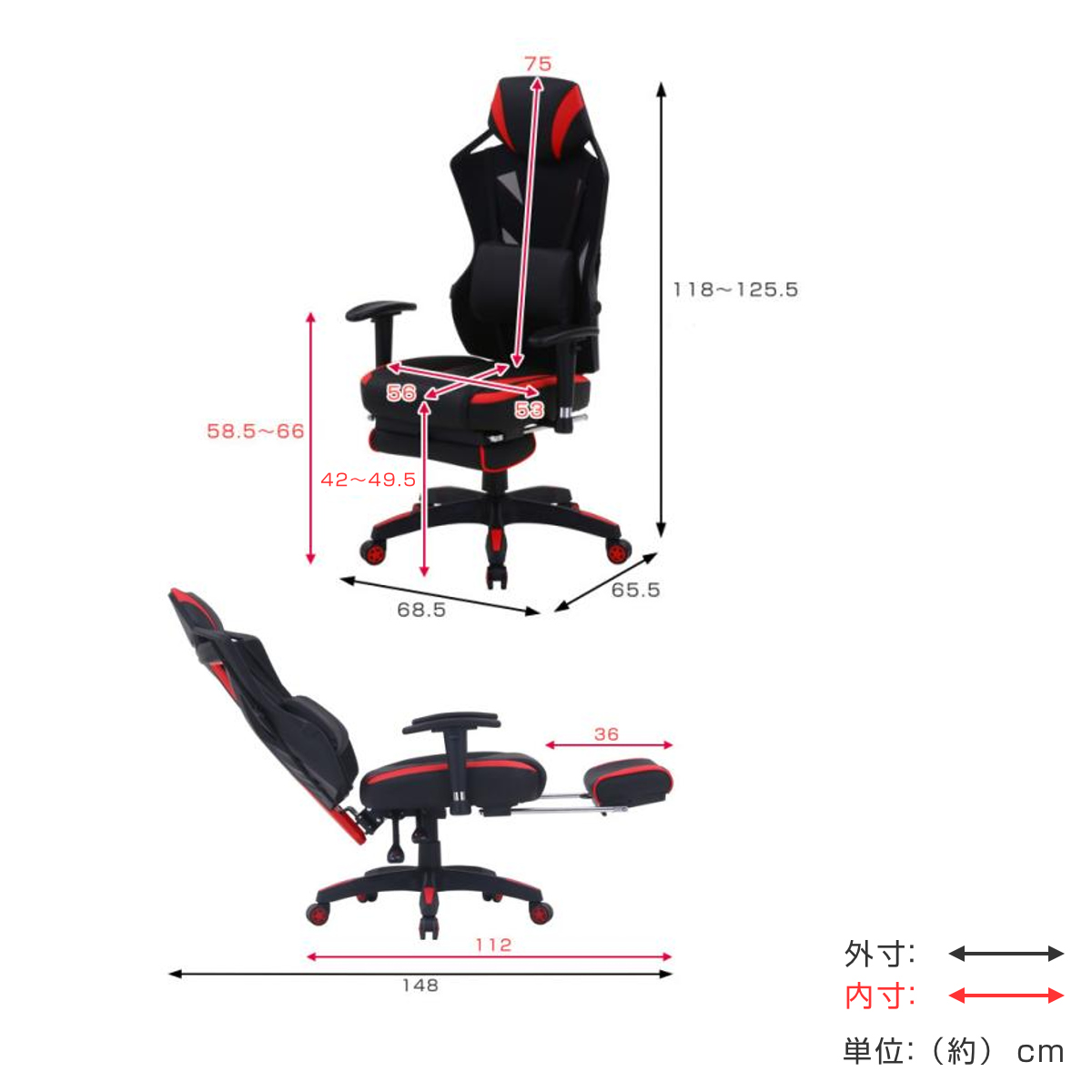 | サイズ | 約 幅68.5×奥行148×高さ125.5(cm) 昇降式:高さ約 118~125.5 (cm) 座面高:約 42~49.5 (cm) リクライニング機能付き:奥行約 65.5~148 (cm) |