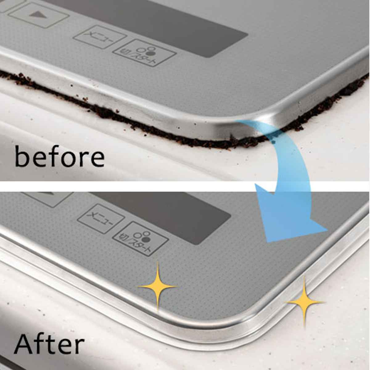 フチのすき間の汚れをかきだすスクレーパーが付属しています。油や水気があるとフレームカバーが取付けにくくなるので、スクレーバーやフキンを使用し、フチの下やフチ部分の掃除をしてください。