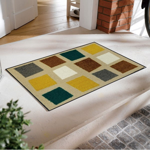 アシンメトリーなスクエアが描かれた、どんなお部屋にも合わせやすいお洒落な玄関マットです。モダンインテリアに調和するデザイン性の高さで、幅広い世代から愛される魅力を持っています。