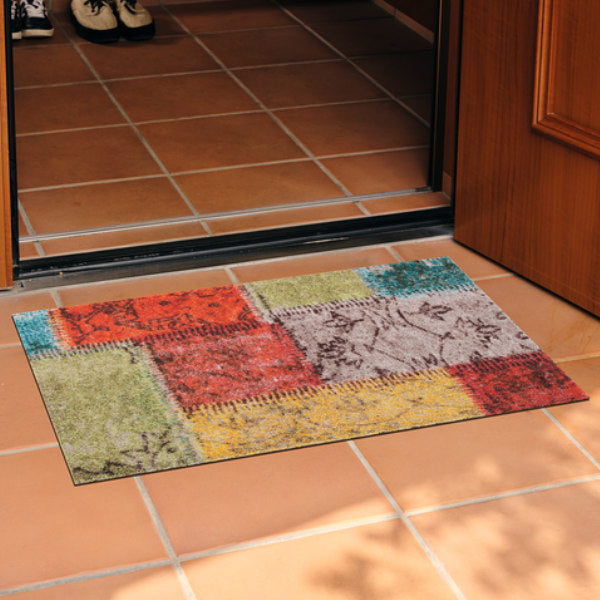 複数の色の生地を継ぎ合わせたようなパッチワーク風のデザインです。絶妙な色のバランスで、落ち着いた仕上がりになっています。お気に入りのマットを敷いて、帰りたくなる玄関を演出します。