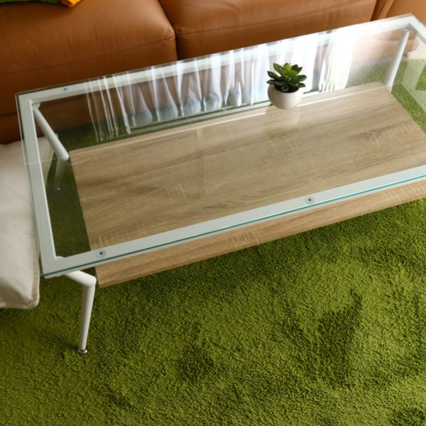 天板下には棚板が付属しているので、読みかけの雑誌を収納することが出来ます。また、ガラスの天板なのでお気に入りの小物をディスプレイして楽しむこともできます。
