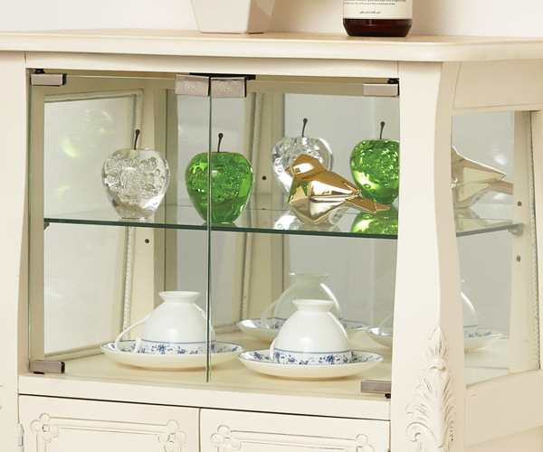 上部扉はプッシュ式のガラス扉で、大切なコレクションをホコリから守ります。ガラス棚板が1枚付いており、3cnピッチ、3段階で高さ調節ができます。ガラス棚板が光を反射して、コレクションをより明るく美しく演出します。