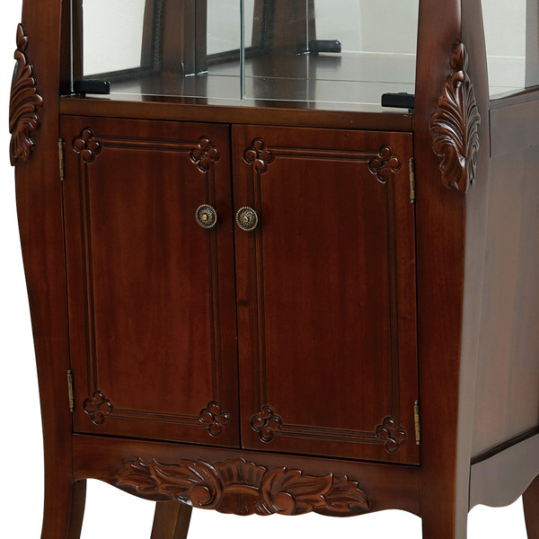 センダン科の広葉樹で世界三大銘木のひとつ、マホガニーを使用したガラスキャビネットです。高級感溢れるデザインは、素敵なインテリア空間を演出でき、お気に入りの小物や香水、食器などを美しくディスプレイできます。