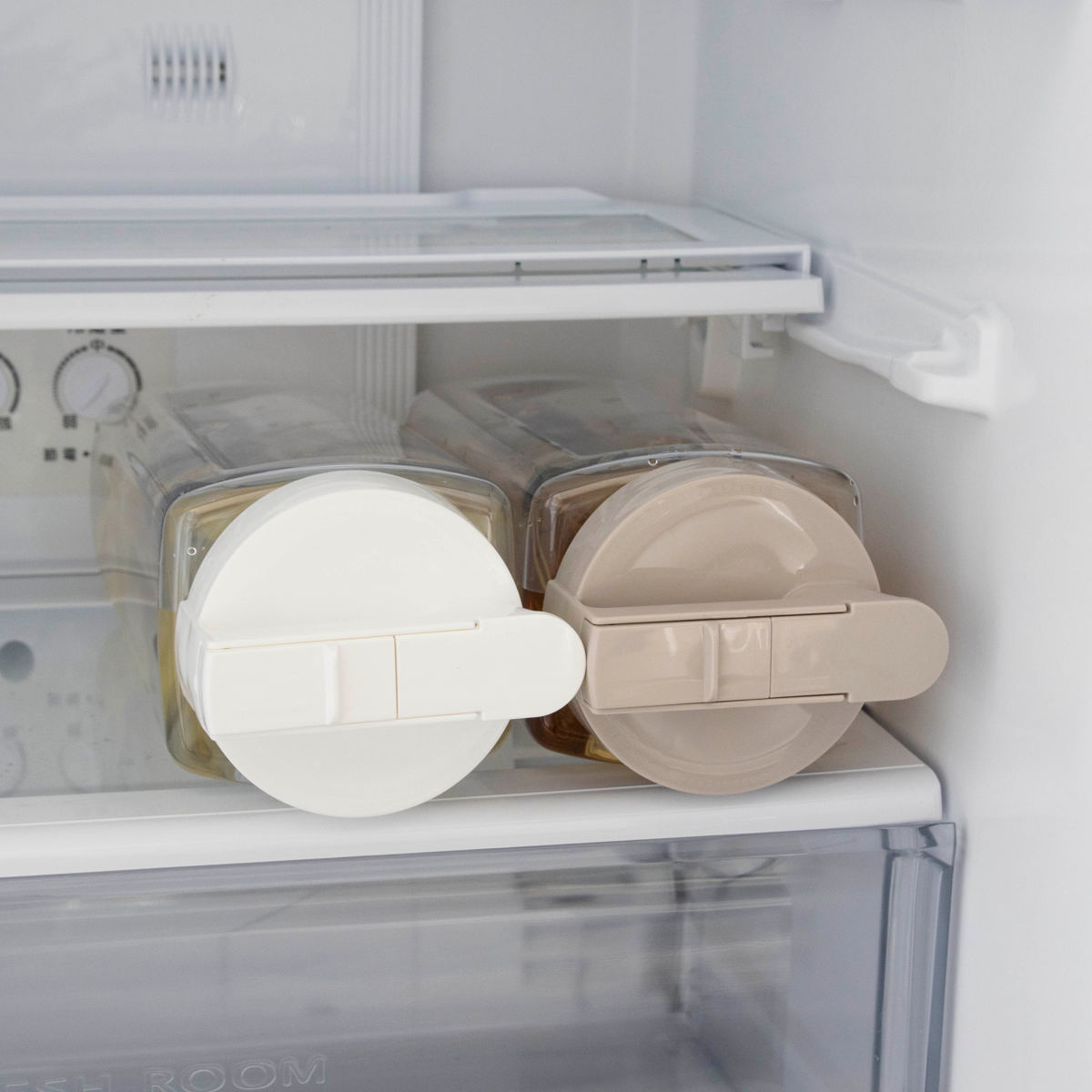 パッキン付きなので密閉性が高く、冷蔵庫の棚にヨコ置きで収納ができます。350ml缶ほどの高さなので、縦幅のスペースを圧迫しません。