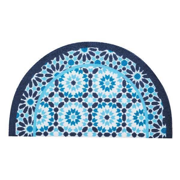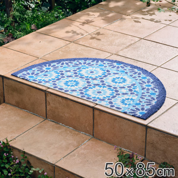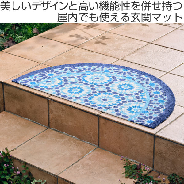 半円形が特徴的な玄関マットです。鮮やかなブルーを基調とした花柄で、爽やかに家族やお客様を出迎えてくれます。お気に入りのマットを敷いて、帰りたくなる玄関を演出します。