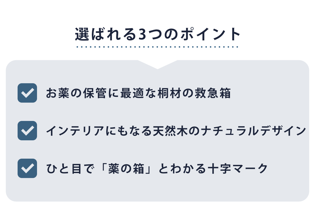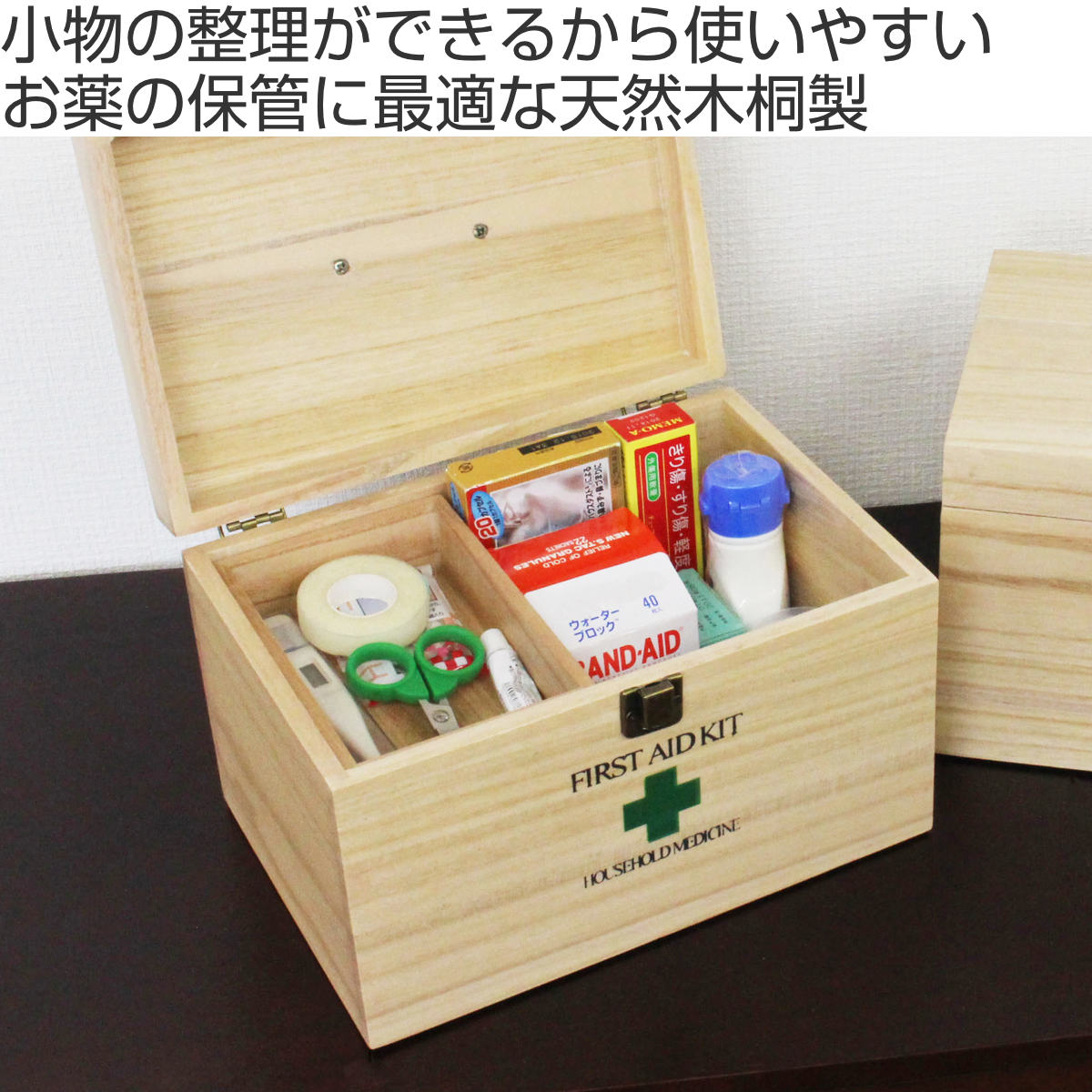使いたい時にサッと出せるとても軽くて使いやすい天然木の救急箱です。桐材の調湿効果があるのでお薬の保管に最適です。