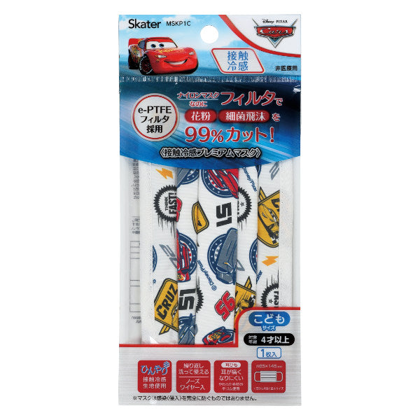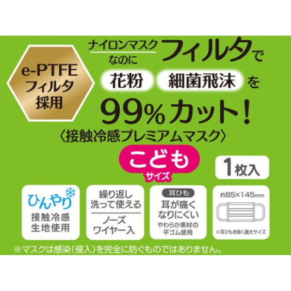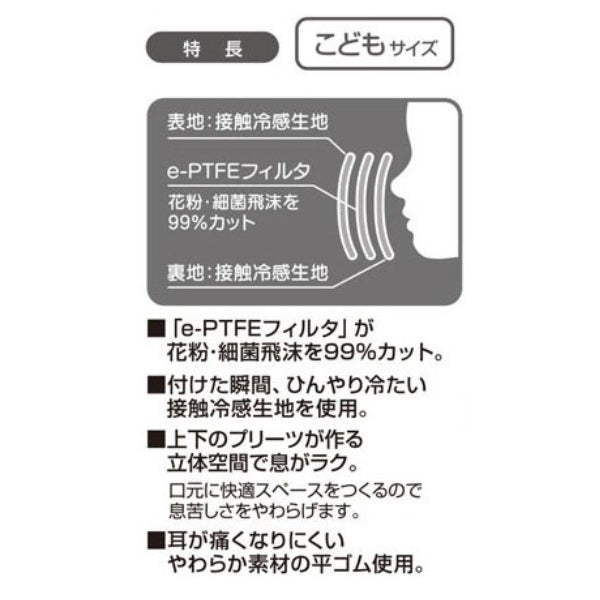 キャラクター柄がかわいい子ども用ガーゼマスクです。表地と裏地のガーゼの間に花粉や細菌飛沫を99%カットするe-PTFEフィルタが入っています。つけた瞬間ひんやり冷たい接触冷感生地を使用しているので、夏の汗ばむ季節でも蒸れにくくなっています。