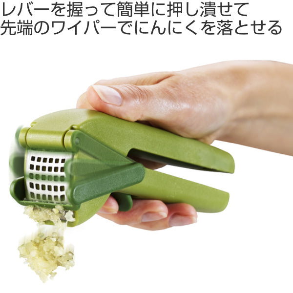 ハンドルを握るとにんにくを潰せます。ハンドルのトリガーを引くと、ヘッドのワイパーブレードが潰したにんにくをこそぎ落としてくれます。
