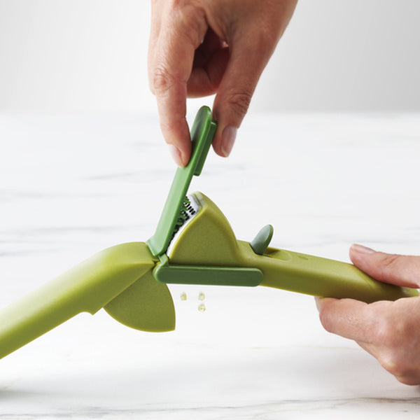 ヘッドの中に残ったにんにくを取るのに便利なクリーニングツール付きです。クラッシャーの穴を掃除できる突起付きの面と、ヘッド内部を掃除できるスクレーパーの両面仕様で、ハンドルに収納することが出来ます。