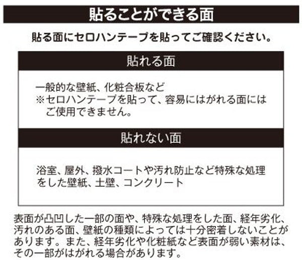 | 備考 | よこ貼りタイプ 【貼れる面】:一般的な壁紙、化粧合板など ※セロテープを貼って、容易にはがれる面にはご使用できません。 【貼れない面】:浴室、屋外、撥水コートや汚れ防止など特殊な処理をした壁紙、土壁、コンクリート |
