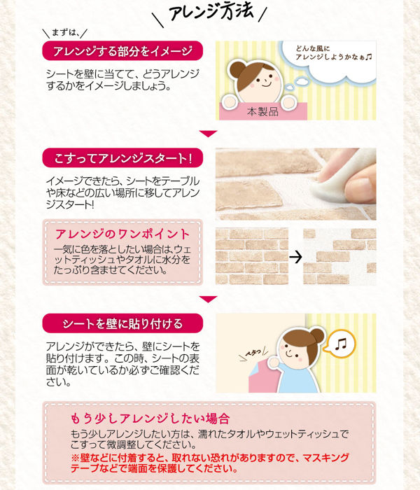 シートを壁に当てて、アレンジする部分をイメージします。イメージができたら、テーブルや床などの広い場所に置いて、濡れたタオルやウェットティッシュでこすってアレンジしていきます。アレンジできたら、表面を乾燥させて壁にシートを貼り付けます。