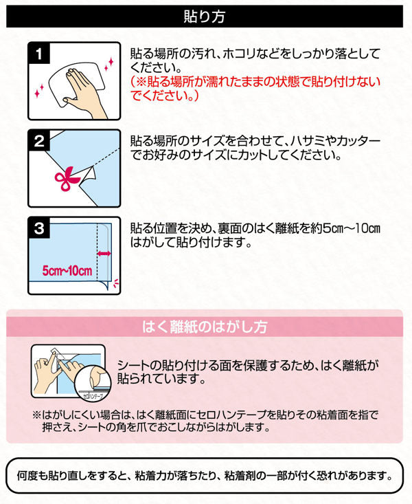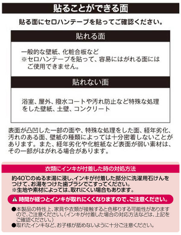 | 備考 | よこ貼りタイプ 貼れる面:一般的な壁紙、化粧合板など ※セロテープを貼って、容易にはがれる面にはご使用できません。 貼れない面:浴室、屋外、撥水コートや汚れ防止など特殊な処理をした壁紙、土壁、コンクリート |